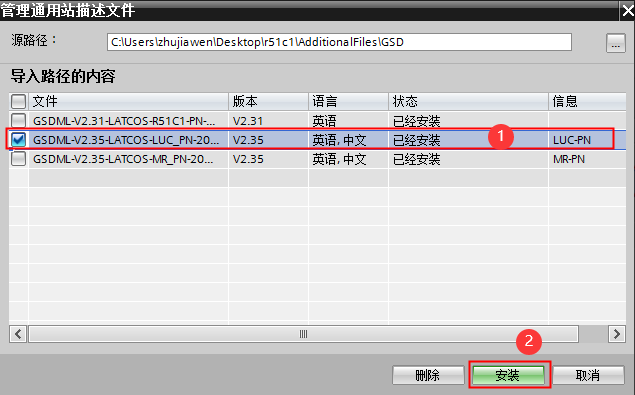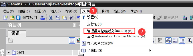 添加凌科LUC-PN的管理通用站描述文件。點擊菜單欄的“選項” 按鈕, 選擇“管理通用站描述文件(GSD)”:
