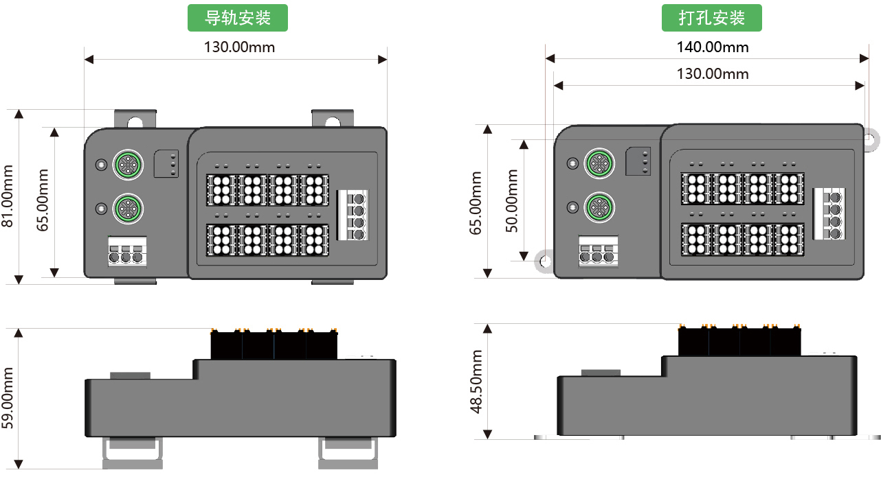 安裝方式:DIN35導(dǎo)軌安裝或雙側(cè)耳打孔安裝